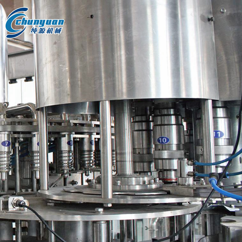 純源機械廠家生產制造的全自動果蔬汁飲料灌裝機集沖洗、灌裝、旋蓋于一體,主要適用于果汁、果蔬汁、橙汁、酵素等的熱灌裝。