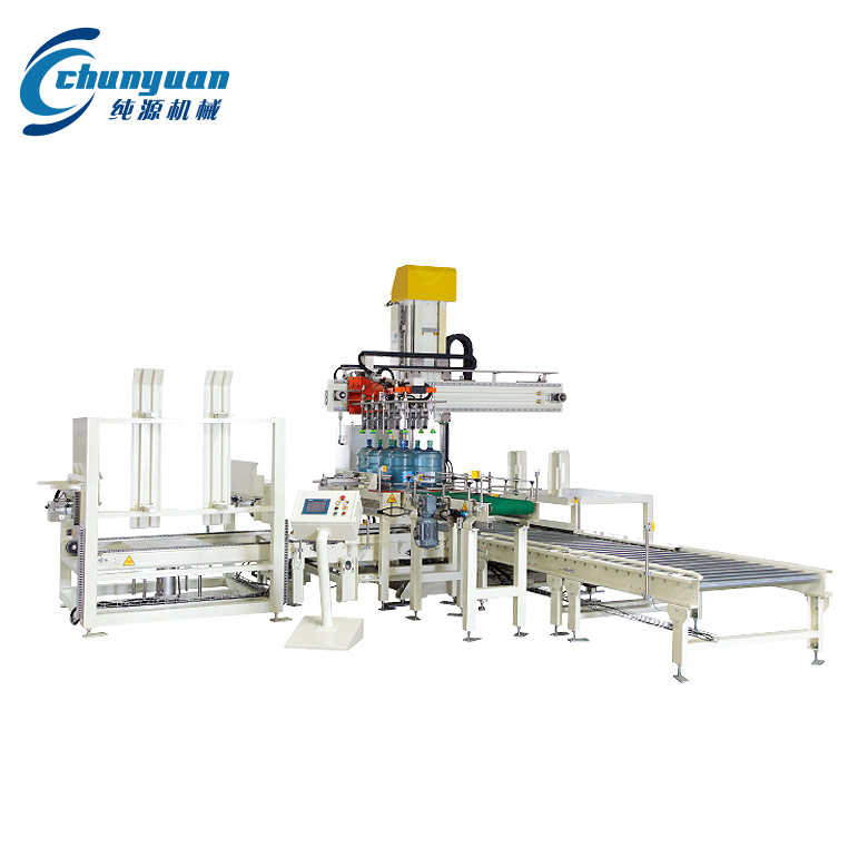 大桶碼垛機是將已灌裝好的5加侖桶按一定排列碼放在托盤(木質、塑膠)上,進行自動堆碼,可堆碼多層,然后自動輸至實托工位,便于叉車運至倉庫儲存。本設備采用PLC+觸摸屏控制,實現智能化操作管理,實現人機對話,可顯示生產速度,故障原因及位置,自動化程度高。簡便、易掌握,可大大地減少勞動力和降低勞動強度。